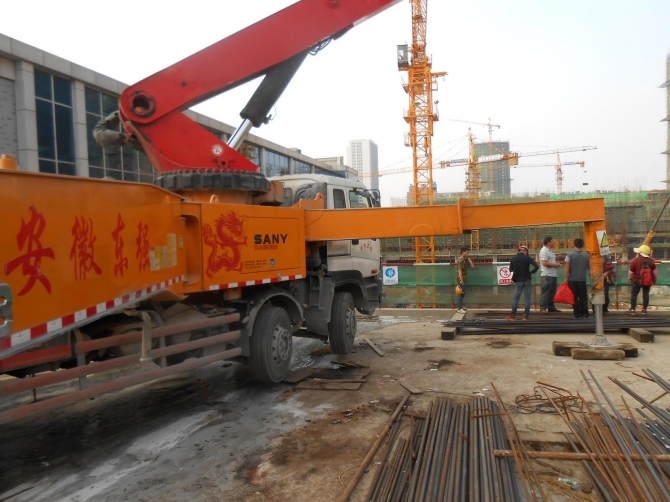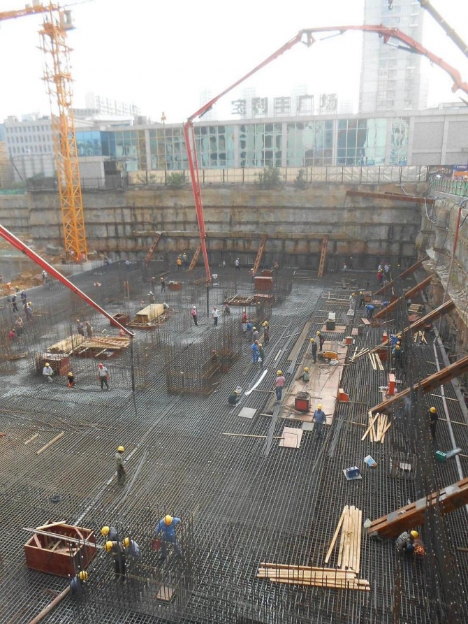 寶利豐廣場項目樓位于徽州大道與靶場路交口,其中1#樓采用樁筏基礎(chǔ),其中核心筒區(qū)域筏板厚度為7-8m,其他區(qū)域厚度為3.2m,混凝土強度等級為C40P8,一次性連續(xù)澆筑。施工現(xiàn)場布置56m汽車泵一臺,46m汽車泵兩臺,地泵一臺,截止2015年09月27日用時約40小時,8600立方混凝土全部澆筑完畢。
