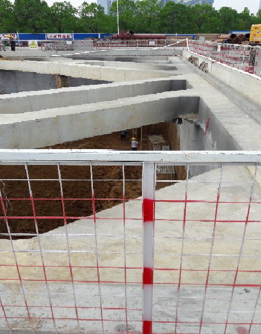 臺(tái),標(biāo)準(zhǔn)段主體結(jié)構(gòu)為地下二層單柱雙跨鋼筋混凝土框架結(jié)構(gòu),采用明挖順做法施工;車站總長(zhǎng)度193m,標(biāo)準(zhǔn)段寬度為20.7m,標(biāo)準(zhǔn)段基坑深度平均16.4m。