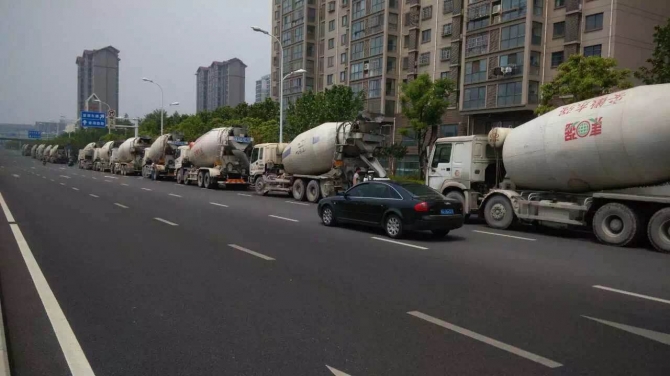下圖為澆筑該項(xiàng)目主樓12000m3大體積同時(shí)現(xiàn)場(chǎng)等待的砼攪拌車(chē)。
